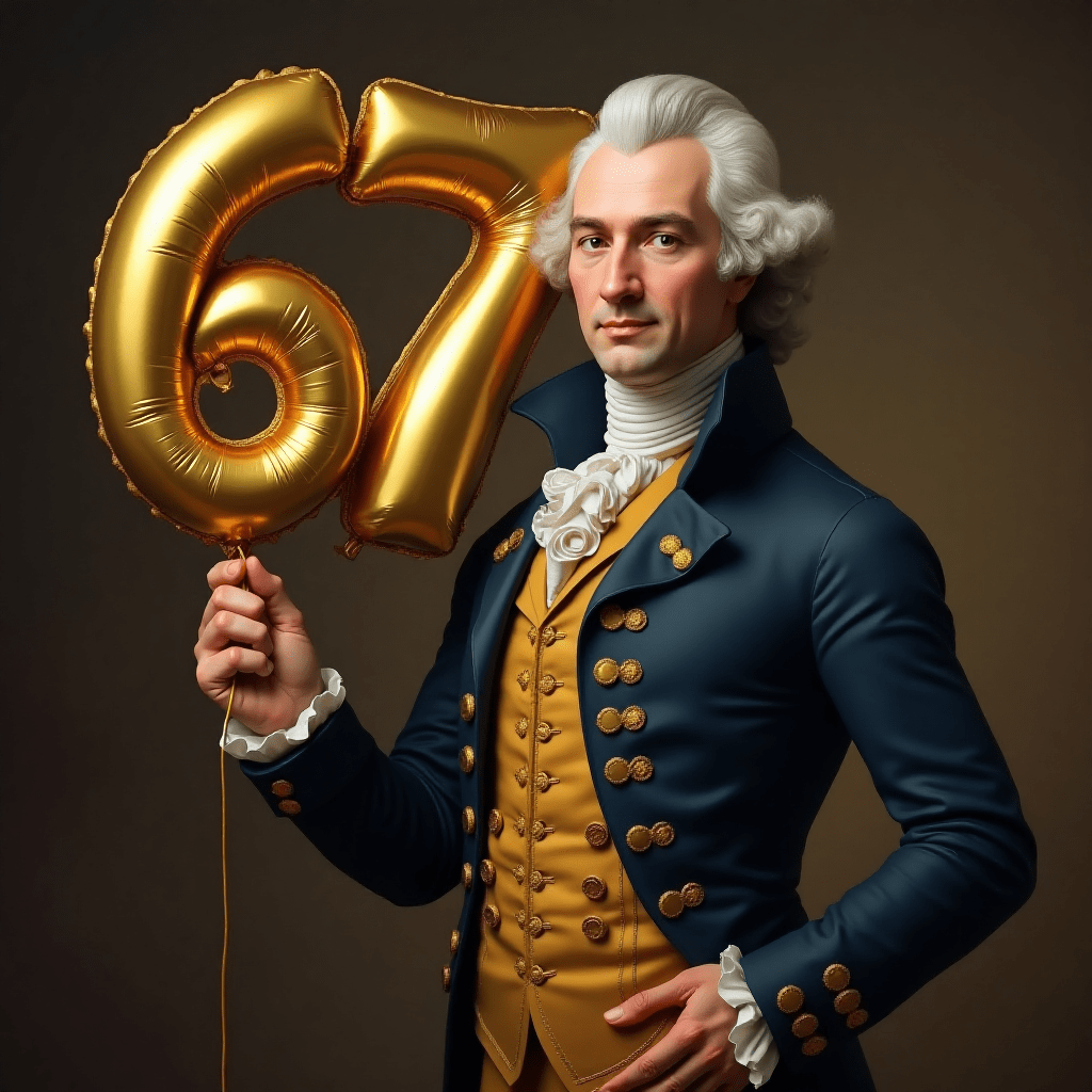 Alexander Hamilton holding a 67 Number Balloon.