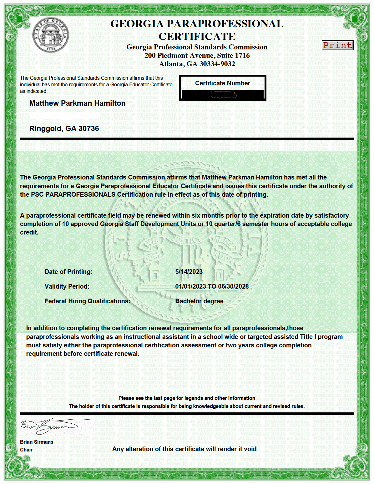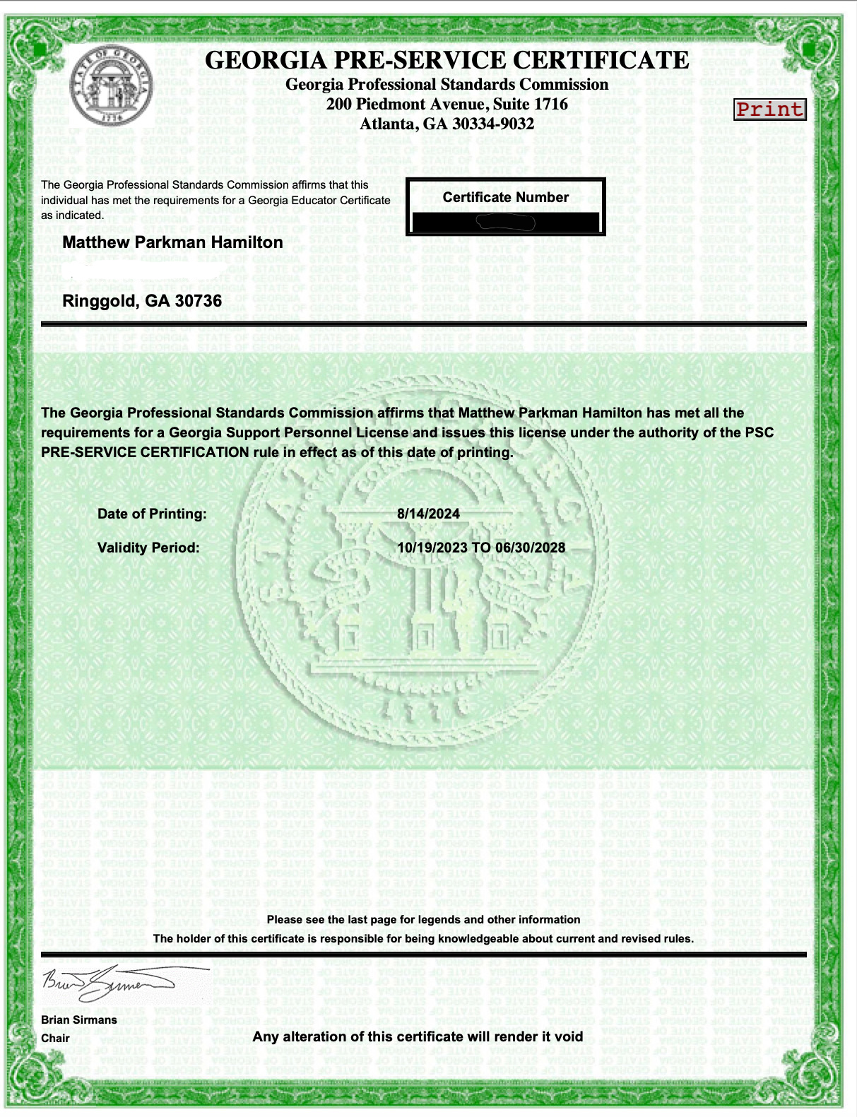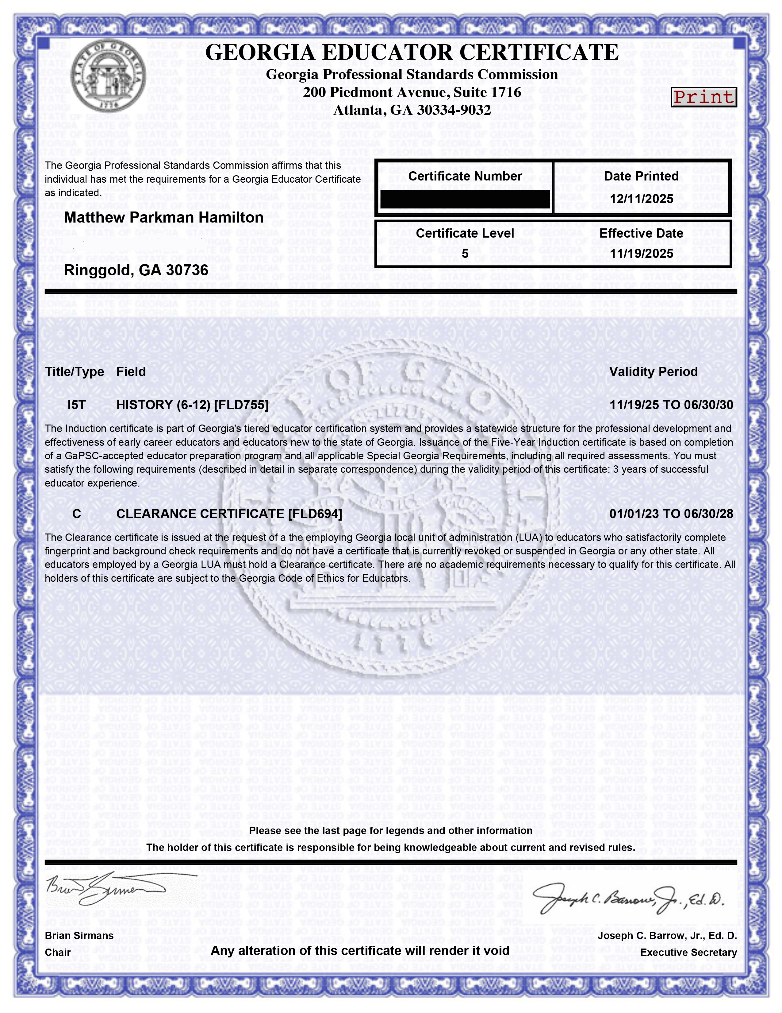 My name is Matt Hamilton, and I am a passionate educator dedicated to fostering empathy, inquiry, and meaningful relationships in the classroom. I hold a Master’s in Secondary Education from Grand Canyon University (November 2025) and a Level 5 Georgia educator certificate. My teaching experience spans elementary (as a SPED Paraprofessional), middle (as a Substitute Teacher), and high school settings (as a Student Teacher and Substitute Teacher). Most recently, I completed my student teaching in ninth-grade American Government at Heritage High School in Ringgold, Georgia.