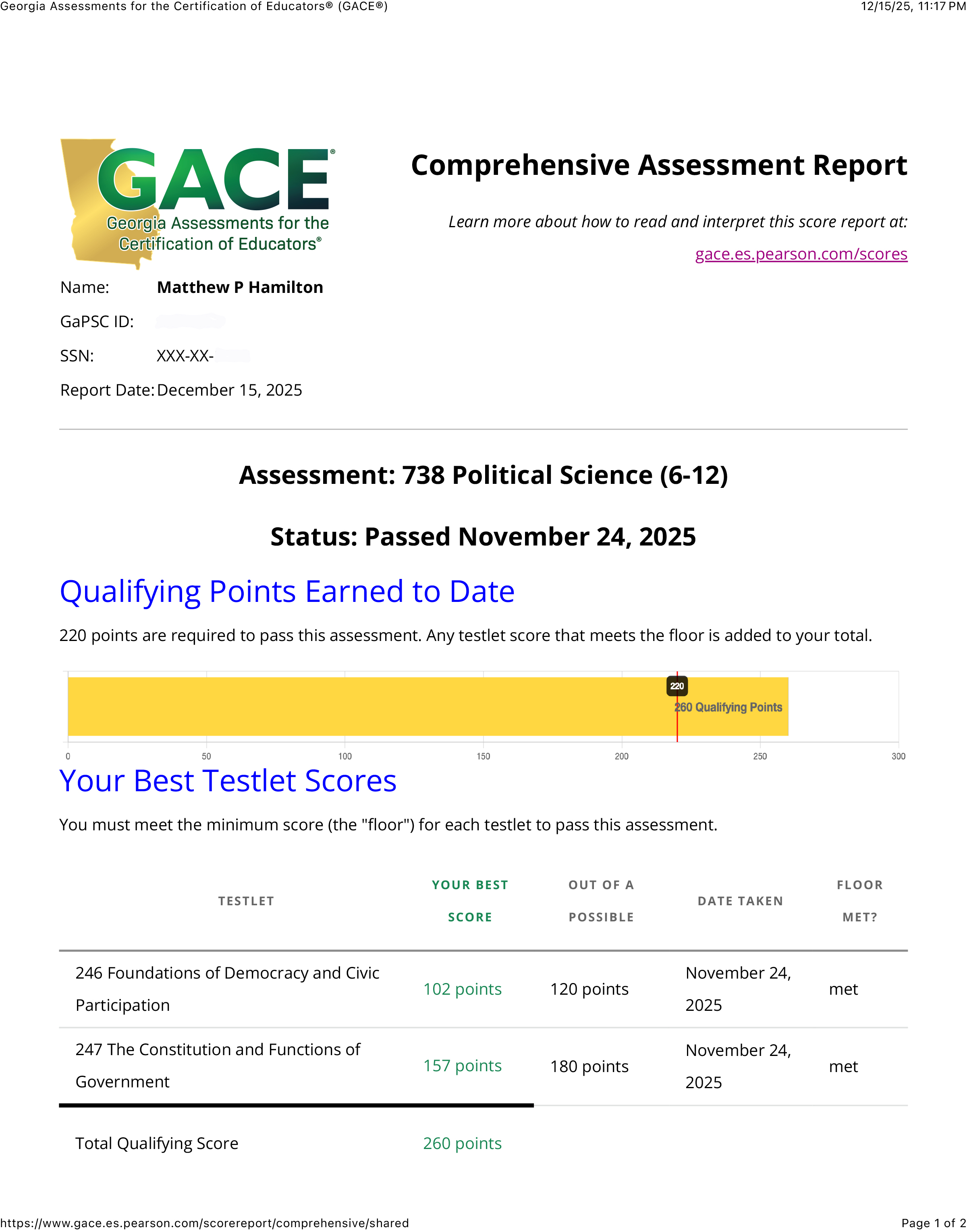 GACE Score Report – Test 738 (Political Science, both 246 and 247)